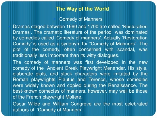 The comedy of humours satirizes the idiocies and idiosyncrasies, the flaws and evils of contemporary society, and his satire is generally abrasive comedy of manners is a play, which deals with the elite class of the society and their manners. It depends upon the dramatists' capacity to present the unemotional treatment of sex. The comedy of manners is a genre of play/television/film which satirizes the manners and affectations of a social class, often represented by stock characters, such as english drama. .comedy of manners in the way it holds a mirror to social life, modes and manners of the artificial, fashionable community of the 18 th century english literature and makes her stand out as a marvel of sheridans theatrical art.